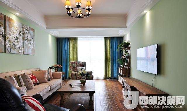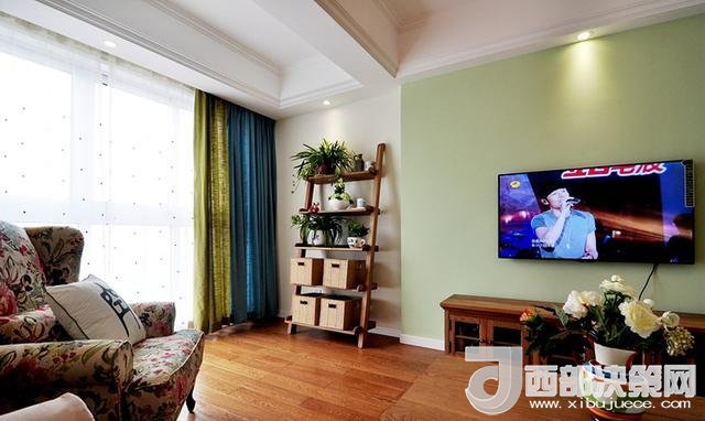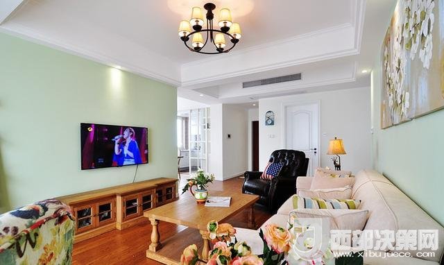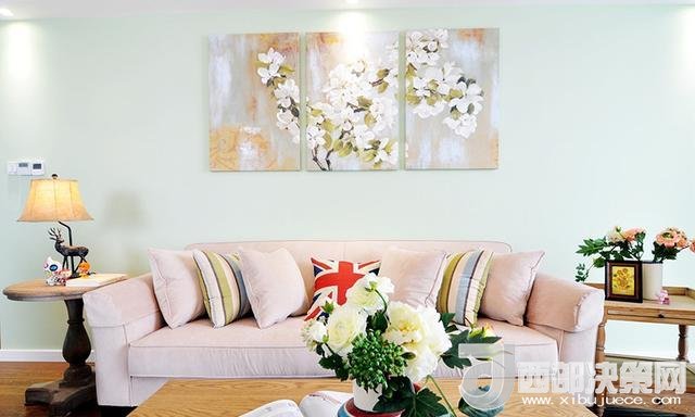 沙發(fā)墻上的油畫(huà)和茶桌刪搞得插花,遙相呼應(yīng),給人清新自然之感。