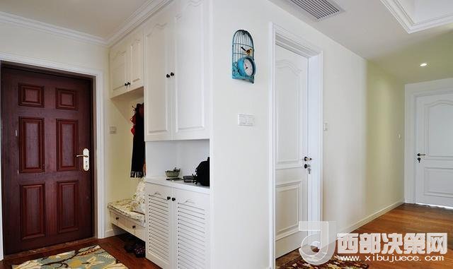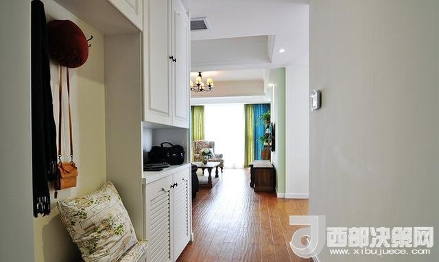 進(jìn)門(mén)玄關(guān),貼壁做了一排的櫥柜,模仿國(guó)外家居設(shè)計(jì),做了一個(gè)連體的矮柜換鞋凳,上方安裝掛鉤吊衣服。