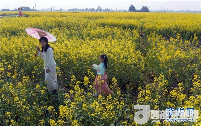 3月11日,在成都邛崍市冉義鎮(zhèn),來(lái)自成都的趙梓蓉帶著女兒在油菜花地里賞花拍照。