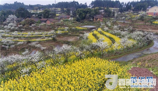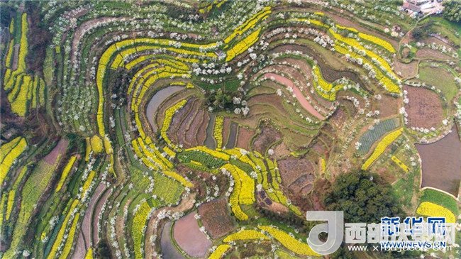 俯瞰四川省犍為縣塘壩鄉(xiāng)新房村田園一角,梯田上的油菜花、李花競(jìng)相開(kāi)放(3月12日攝)。