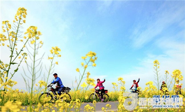 3月11日,在成都邛崍市冉義鎮(zhèn),幾名騎行愛(ài)好者穿行在花田之間。