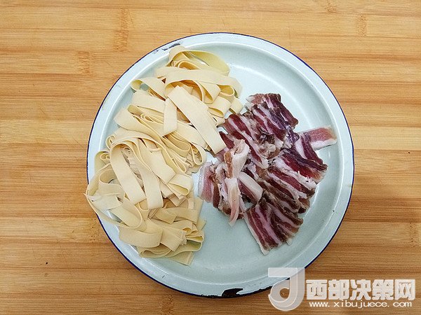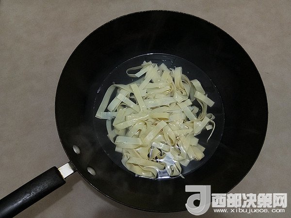 3.千張切寬一些的絲,咸肉用溫水浸泡一會(huì),洗凈切薄片。