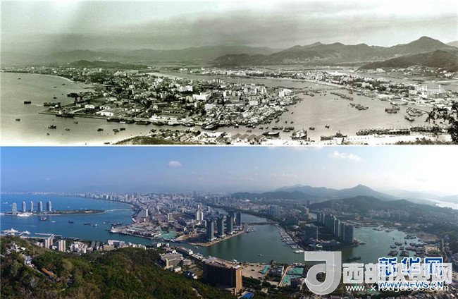拼版照片為在三亞市鹿回頭景區(qū)鳥瞰三亞市景今昔對(duì)比(上圖為1991年2月新華社記者姜恩宇攝,下圖為2018年4月4日新華社記者郭程攝)。