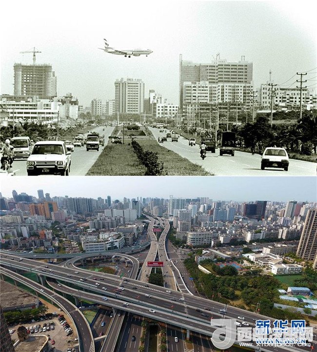 拼版照片為??谑旋埨ツ下方裎魧?duì)比(上圖為1993年6月30日新華社記者姜恩宇攝,下圖為2018年4月14日新華社記者郭程攝)。