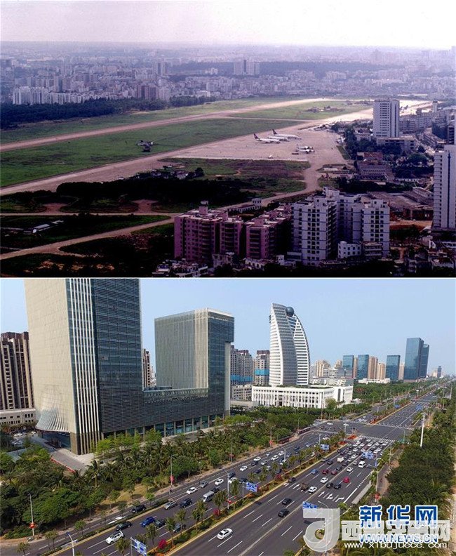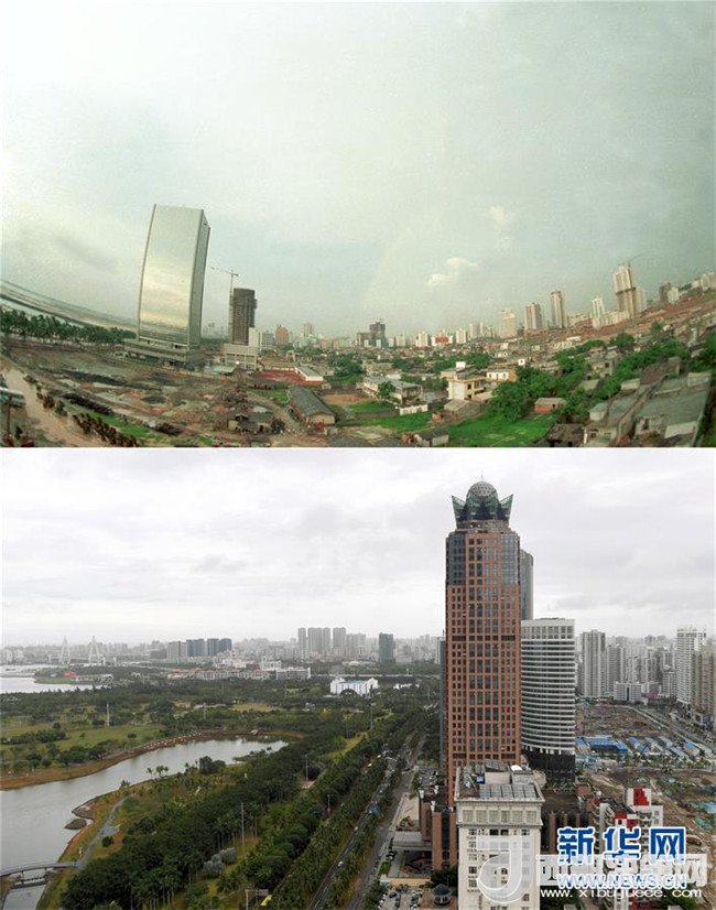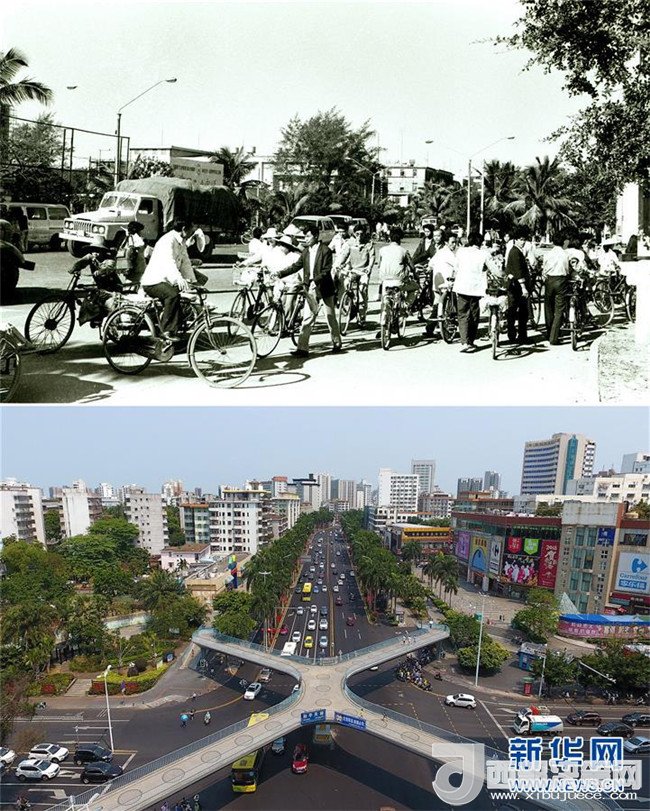 拼版照片為??谑泻8方裎魧?duì)比(上圖為1988年12月新華社記者姜恩宇攝,下圖為2018年4月14日新華社記者郭程攝)。