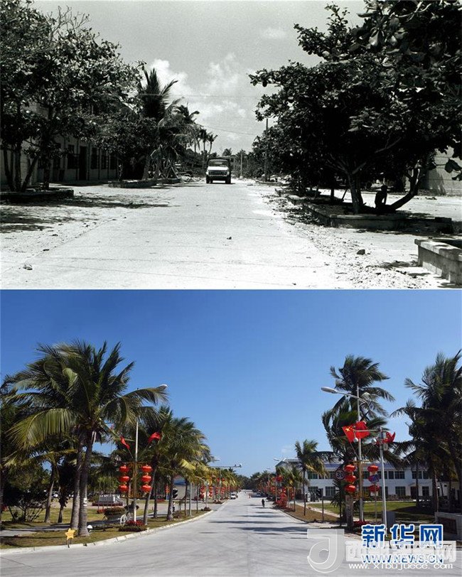 拼版照片為西沙永興島北京路今昔對(duì)比(上圖為1991年5月新華社記者姜恩宇攝,下圖為2016年2月5日新華社記者楊冠宇攝)。