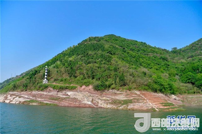 長江重慶萬州區(qū)段一處綠樹叢前的航標(biāo)(4月8日攝)。