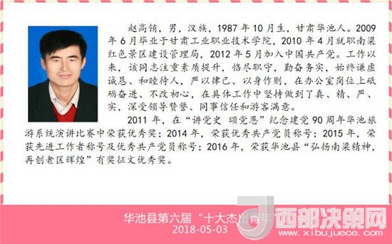 西部決策網(wǎng)——西部大開發(fā)訊(帥華鋒 張曉紅 通訊員 陳彥榮 柴金霞)5月3日,在南梁法官教育基地講法堂,華池團縣委隆重召開紀念“五四”運動99周年暨第六屆“十大杰出青年”表彰大會。甘肅南梁革命紀念館趙高銪同志榮獲華池縣第六屆“十大杰出青年”榮譽稱號。