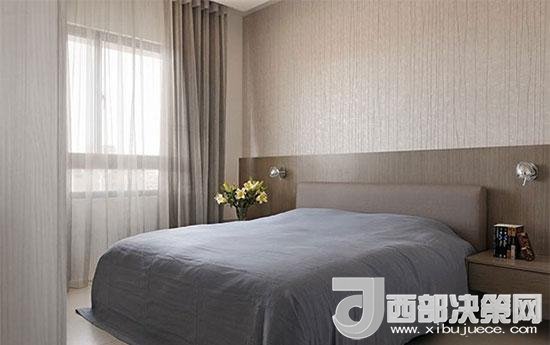 主臥以淺色立體壁紙與深色木皮墻面,深淺對(duì)比出沉靜地臥眠氛圍。
