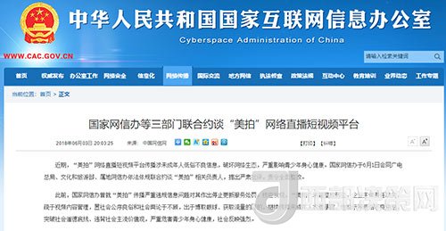 北京6月4日電據(jù)國家網(wǎng)信辦官網(wǎng)消息,近期,“美拍”網(wǎng)絡(luò)直播短視頻平臺傳播涉未成年人低俗不良信息,破壞網(wǎng)絡(luò)生態(tài),嚴重影響青少年身心健康。國家網(wǎng)信辦于6月1日會同廣電總局、文化和旅游部、屬地網(wǎng)信辦依法依規(guī)聯(lián)合約談“美拍”相關(guān)負責(zé)人,提出嚴肅批評,責(zé)令全面整改。