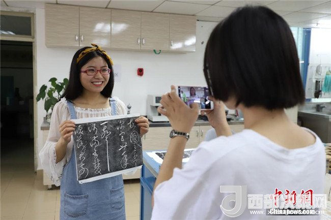 6月9日,一位女同學(xué)與自己的拓片作品合影。當(dāng)日,貴州省古籍保護(hù)中心在貴州省圖書館舉辦“古籍修復(fù)技藝體驗”活動?;顒娱_展了古籍修復(fù)、碑文傳拓等技藝體驗。眾多高校師生和民眾紛紛前往體驗。中新社發(fā)瞿宏倫攝
