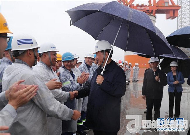 風急云低,雨流如注。13日下午,習(xí)近平來到中集來福士海洋工程有限公司煙臺基地。作為國內(nèi)率先進入海洋工程行業(yè)的企業(yè),中集來福士用10年左右時間,國產(chǎn)化率從不足10%提高到60%。在廠區(qū)碼頭上,習(xí)近平撐著雨傘,趟著積水,近距離察看??吭谶@里的自升式修井生活平臺,遠眺“藍鯨1號”超深水雙鉆塔半潛式鉆井平臺、“泰山”龍門吊、海洋牧場平臺,向企業(yè)負責人詳細了解高端海洋工程設(shè)備制造、維護、運行情況。海風吹起了衣襟,雨水打濕了褲腿。習(xí)近平站在雨中,同圍攏過來的工人們一一握手、親切交談,向作業(yè)平臺上的工人們揮手致意。習(xí)近平指出,國有企業(yè)特別是中央所屬國有企業(yè),一定要加強自主創(chuàng)新能力,研發(fā)和掌握更多的國之重器。國有企業(yè)要深化改革創(chuàng)新,努力建成現(xiàn)代企業(yè)。要堅持黨對國有企業(yè)的領(lǐng)導(dǎo)不動搖,堅持建強國有企業(yè)基層黨組織不放松,為做強做優(yōu)做大國有企業(yè)提供堅強組織保證。