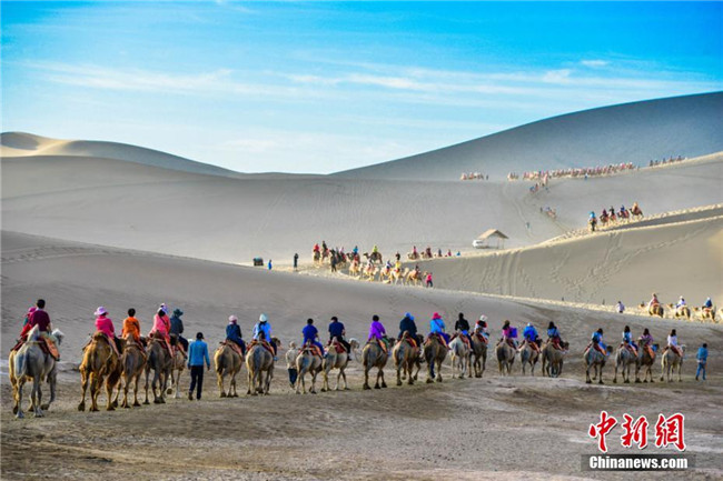 剛剛過去的端午小長(zhǎng)假期間,絲綢之路國際旅游名城甘肅敦煌迎來旅游高峰,鳴沙山月牙泉人流如織、駝隊(duì)如龍,世界文化遺產(chǎn)莫高窟“門庭若市”。據(jù)敦煌市旅游部門19日統(tǒng)計(jì),今年端午節(jié)期間,敦煌市接待中外游客12.35萬人次,同比增長(zhǎng)35%。其中,莫高窟接待游客21501人次,同比增長(zhǎng)29.44%;鳴沙山月牙泉景區(qū)接待游客24050人次,同比增長(zhǎng)31.86%。
