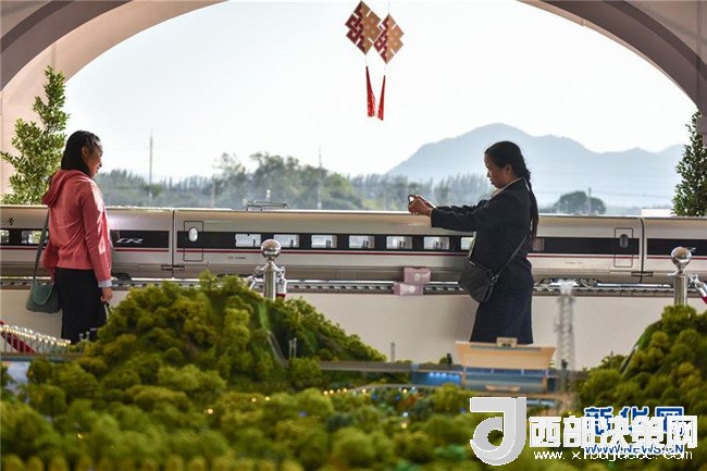 在泰國東北部呵叻府巴沖縣,參觀者在中泰鐵路合作項(xiàng)目一期工程開工儀式上與展出的中國復(fù)興號(hào)高鐵列車模型合影(2017年12月21日攝)。新華社記者 李芒茫 攝