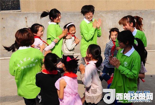 2011年4月28日,武漢理工大學研二學生郎坤和農(nóng)民工子弟學校武漢凌智小學的孩子們一起在屋頂平臺上做游戲。新華社記者 程敏 攝