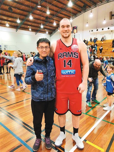 圖為吳宇森在新西蘭球館觀看籃球賽時(shí)和球員合影留念。
