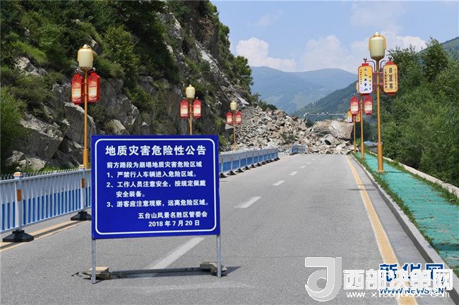 這是五臺山景區(qū)管委會在梵仙山路段山體崩塌現(xiàn)場設置的警示牌(7月21日攝)。受降雨影響,山西五臺山景區(qū)于7月19日和20日發(fā)生兩起山體崩塌地質(zhì)災害,沒有造成人員傷亡和車輛損失。新華社發(fā)(楊晨光攝)
