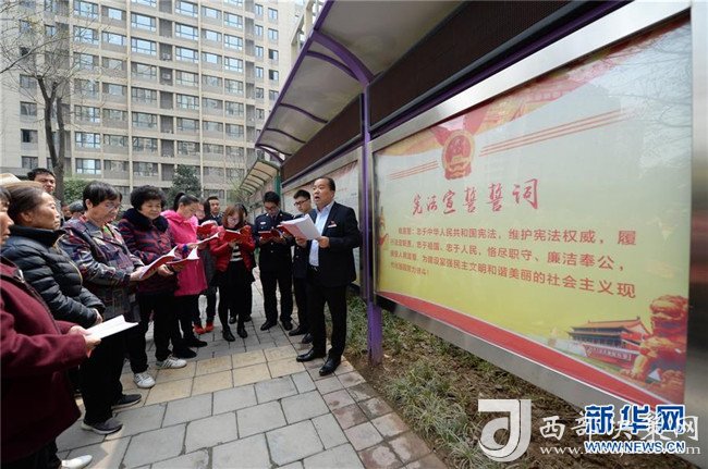 2018年3月20日,陜西寶倫律師事務所專職律師白銀濤(右一)在西安華遠君城社區(qū)宣傳憲法知識。新華社記者 李一博 攝