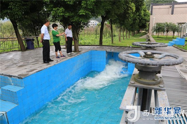 2018年7月15日,貴州興義市桔山河市級河長葛佳華(中)、鎮(zhèn)級河長陳再云(左)和村級河長陳明君在桔山污水處理廠的出水口進行巡查。新華社記者 歐東衢 攝