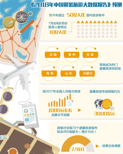 據(jù)中國旅游研究院等單位發(fā)布的《2018年中國避暑旅游大數(shù)據(jù)報告》(下稱《報告》)預測,在今年超過50億人次國內(nèi)旅游者中,7月份和8月份旅游人數(shù)將達10億人次,占全年游客數(shù)量的五分之一。其中,避暑旅游規(guī)模預計占一半,約5億人次?!秷蟾妗贩Q,這一數(shù)字將使中國成為全球最大的避暑旅游市場。