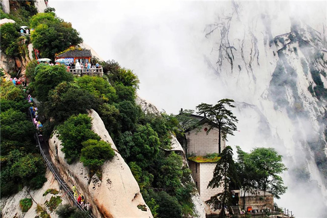 魏晉南北朝時,還沒有通向華山峰頂?shù)牡缆?。直到唐朝,隨著道教興盛,道徒開始居山建觀逐漸在北坡沿溪谷而上開鑿了一條險道,形成了"自古華山一條路"。