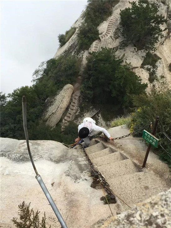 從視覺沖擊上來看,鷂子翻身比不上長空棧道,但鷂子翻身的難度更大一些。首先梯道傾斜,且向內(nèi)傾斜。其次鐵鏈太松動,左右搖擺度偏大,不易抓牢。再者人是從上往下攀緣,崖壁往里傾,眼睛看落腳點(diǎn)有點(diǎn)困難。這就需要手、眼、腳、膝的全面配合了。在鷂子翻身的全途中,不能有絲毫的松懈。手要抓緊,眼要看準(zhǔn),膝要頂住,腳要踩穩(wěn)。全神貫注,集中精神。論難度,這鷂子翻身比長空棧道要多一顆星。小心翼翼,看不見就用腳來試探。一步一個坑的往下攀巖。有一小段只有一邊的鐵鏈可以抓握。這一段需要掌握好身體的平衡度。