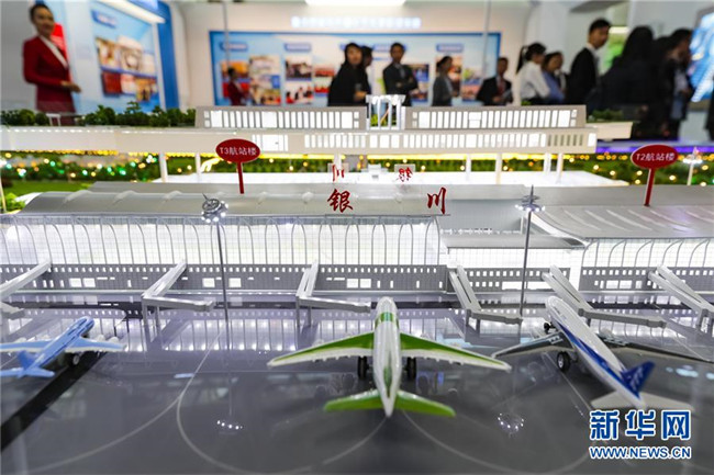 9月19日,觀眾在參觀展覽上展出的銀川河?xùn)|國(guó)際機(jī)場(chǎng)綜合交通樞紐模型。9月19日,寧夏回族自治區(qū)成立60周年大型成就展在銀川國(guó)際會(huì)展中心開幕。記者沈伯韓攝