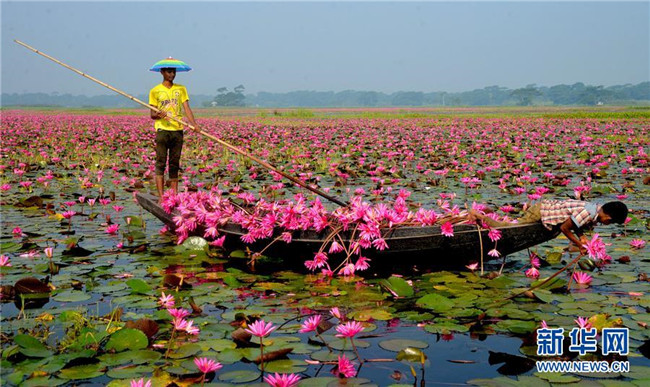 10月7日,在孟加拉國(guó)巴里薩爾地區(qū),當(dāng)?shù)鼐用裨诓烧彙?近日,孟加拉國(guó)巴里薩爾地區(qū)的睡蓮進(jìn)入盛開時(shí)節(jié)。 新華社發(fā)(薩利姆·禮薩 攝)