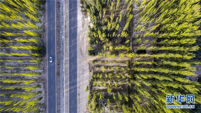 車輛行駛在新疆阿克蘇地區(qū)柯柯牙綠化工程核心區(qū)(9月20日無人機拍攝)。新華社記者 胡虎虎 攝