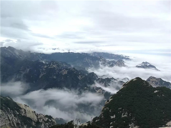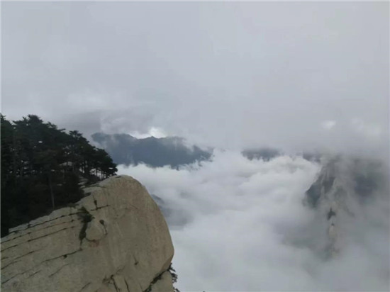 秋季,云海經(jīng)常出現(xiàn)在雨后,融入華山云海,騰云駕霧,風(fēng)拂衣抖,有種飛一樣的感覺。眼前陡壁峭崖蹤影全無,高聳的山峰如飄渺的仙島。華山已無險可防可守,任憑滾滾云海,洶涌澎湃的肆虐。云依著霧,霧掛著云,依偎纏綿,飛升莫測,風(fēng)生變幻。一會兒如獅虎,如鷹鷂,一會兒似神兵,似仙女,蒸騰極富想象力。華山峰巒似懸島明滅,若隱若現(xiàn)。如果夠幸運還會看到彩虹哦!