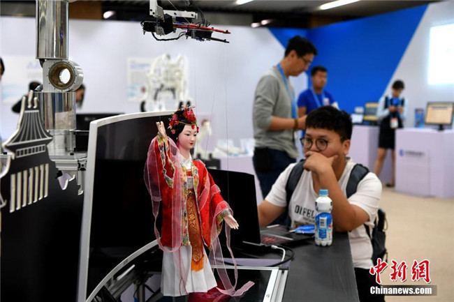 10月13日,第四屆中國“互聯(lián)網(wǎng)+”大學(xué)生創(chuàng)新創(chuàng)業(yè)大賽總決賽在廈門大學(xué)舉行。無人機(jī)、自助售飯機(jī)、人偶互動(dòng)、全息3D智能視頻、機(jī)器人輪椅、3D打印假肢手臂等大學(xué)生研發(fā)設(shè)計(jì)的產(chǎn)品亮相會(huì)場,以“90后”為主的創(chuàng)新創(chuàng)業(yè)生力軍已全面發(fā)力,釋放出“青年+創(chuàng)新創(chuàng)業(yè)”的無窮力量。圖為人偶交互機(jī)器人展示。中新社記者 王東明 攝