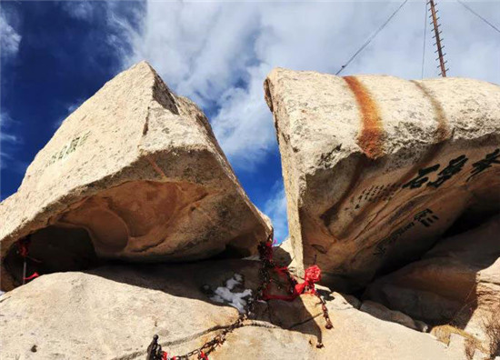 華山以石著名,每一處奇石都有一個(gè)美麗而動(dòng)人的傳說(shuō)。過(guò)了擦耳崖,看到的這兩塊石頭叫“日月巖”,左邊的代表“日”,右邊的代表“月”,上面這四個(gè)字是“云天弧光”,有時(shí)在夜晚,這里會(huì)出現(xiàn)一道非常耀眼的光。相傳武則天當(dāng)年上華山走這里,看到這兩塊形似日月的石頭,就別出心栽地給自個(gè)兒的字號(hào)創(chuàng)造了一個(gè)“瞾”字,因?yàn)檫@兩塊奇石上頂青天,下臨空谷,唯我獨(dú)尊,是光明與權(quán)威的象征。