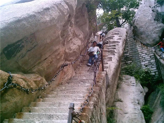 “千尺幢”在華山峪古道“回心石”上,是經(jīng)華山峪登主峰的必經(jīng)之道。這里原為一崖間裂隙,直立70度,后來人們沿隙鑿?fù)爻陕?,有石階370級(jí),階寬僅容半足,游人登臨時(shí),仰視一線天,俯視若臨深井。