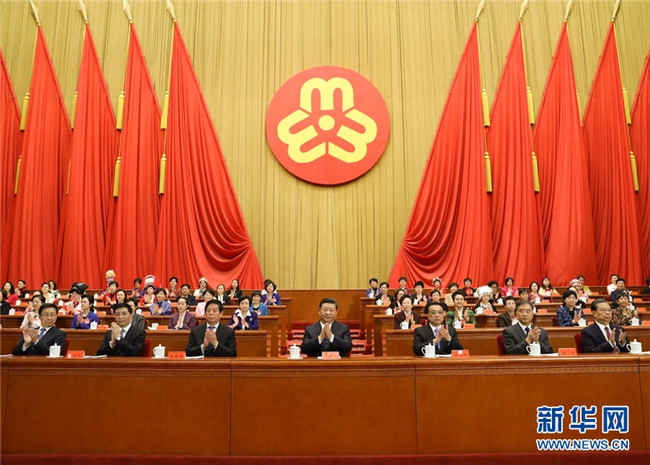 10月30日,中國婦女第十二次全國代表大會在北京人民大會堂開幕。習(xí)近平、李克強(qiáng)、栗戰(zhàn)書、汪洋、王滬寧、趙樂際、韓正等在主席臺就座,祝賀大會召開。 新華社記者 鞠鵬 攝