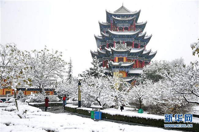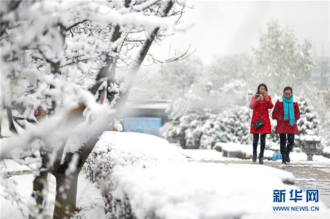 當(dāng)日,甘肅省平?jīng)鍪谐霈F(xiàn)降雪天氣,銀裝素裹的冰雪世界吸引市民前來欣賞雪景。新華社發(fā)(吳希會 攝)