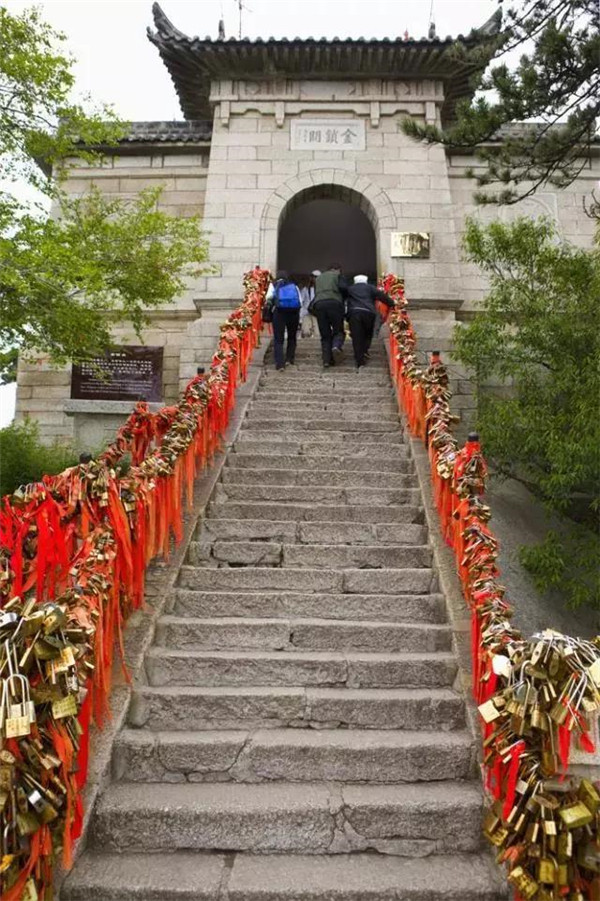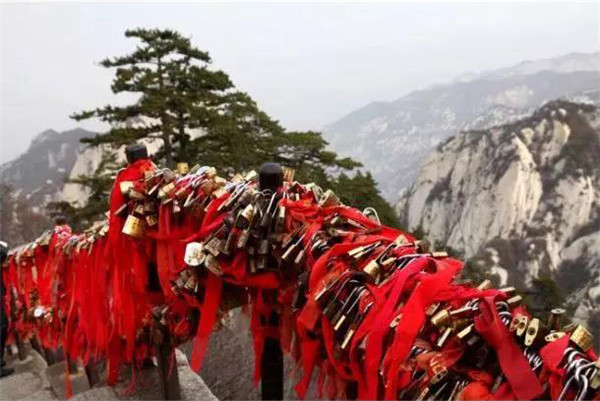 金鎖關(guān)北接五云峰,南控華山主峰,東西兩側(cè)壑深千丈,關(guān)前僅有一米完的臺階石徑。環(huán)周古松蒼翠,奇石林立,常有祥云環(huán)繞,風(fēng)光非常迤麗。“但有女兒初長成,便為三秦姣姣容。”說的就是奇險天下第一山的華山除了以其奇、險、秀而聞名遐邇之外,還別有一番令人動容的金鎖關(guān)風(fēng)景:關(guān)內(nèi)、關(guān)外登山路兩側(cè)的鐵索上,情侶鎖、平安鎖,重重疊疊,紅繩彩線迎風(fēng)搖曳,筑成一道美麗的愛情風(fēng)景線,鎖住對愛情的誓言,表達堅如磐石的愛情忠貞!