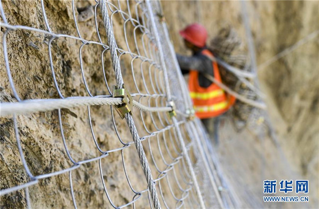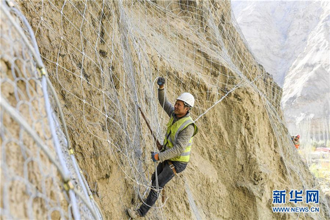 11月12日,在新疆塔什庫爾干塔吉克自治縣大同鄉(xiāng)阿依克日克村的一處路段,工人在峭壁上安裝防護(hù)網(wǎng)。 近日,一支由四川、云南等地工人組成的施工隊(duì)忙碌在帕米爾高原深處的大山中,為塔什庫爾干塔吉克自治縣縣城至大同鄉(xiāng)道路的易落石路段安裝防護(hù)網(wǎng)。崇山峻嶺間,工人要攀爬至峭壁上施工作業(yè),如躍動(dòng)在大山間的“舞者”。據(jù)介紹,這支施工隊(duì)常年活躍在新疆山區(qū)道路的施工現(xiàn)場,為風(fēng)險(xiǎn)路段加裝安全防護(hù)裝置,保障過往車輛和沿途村民出行安全。 新華社記者 胡虎虎 攝