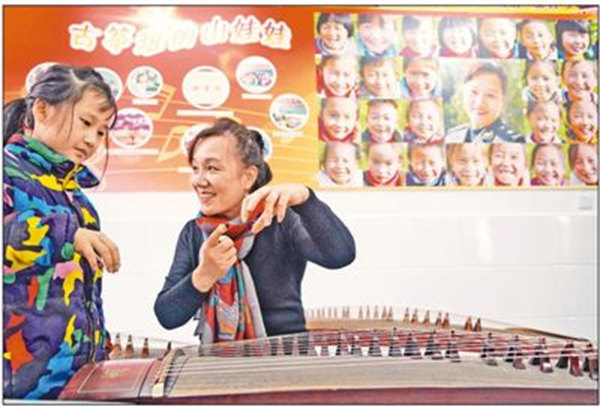 安徽省金寨縣梅山鎮(zhèn)小南京村“山娃娃古箏班”創(chuàng)辦4年來,為三十幾名留守兒童帶來溫暖。創(chuàng)辦人俞曉冬原為南京軍區(qū)前線文工團(tuán)國(guó)家一級(jí)古箏演奏家。2014年,她自籌資金20多萬元購置40多架古箏,在小南京學(xué)校建起一間古箏教室,利用音樂課、課余和周末時(shí)間無償對(duì)山村留守兒童進(jìn)行古箏培訓(xùn)和音樂教育。一年中,俞曉冬有150多天都住在學(xué)校,與山娃們朝夕相處,孩子們親切地稱她為“古箏媽媽”。一批批山娃娃在小學(xué)畢業(yè)前通過全國(guó)器樂水平十級(jí)考試,還多次參加國(guó)內(nèi)公益演出。圖為俞曉冬老師在教留守兒童學(xué)古箏。(趙樹宴/攝)
