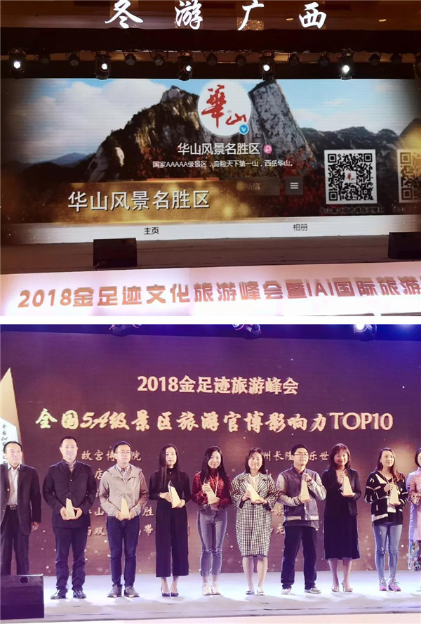 金足跡文化旅游峰會(huì)是由新浪網(wǎng)、微博打造的全國(guó)性旅游峰會(huì),是旅游行業(yè)的年度大會(huì)。本次峰會(huì)上發(fā)布了《2018全國(guó)旅游數(shù)據(jù)報(bào)告》,公布全國(guó)省級(jí)旅游官博影響力TOP10、全國(guó)市級(jí)旅游官博影響TOP10、全國(guó)5A級(jí)景區(qū)官博影響力TOP10及新媒體創(chuàng)新獎(jiǎng)名單,華山風(fēng)景名勝區(qū)榮獲全國(guó)5A級(jí)景區(qū)官博影響力TOP10。
