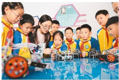 河北省承德市營子區(qū)濱河路小學(xué)將機器人編程課引入學(xué)校,安排專業(yè)教師指導(dǎo)學(xué)生進行機器人編程、機器人設(shè)計等學(xué)習(xí),讓學(xué)生零距離感受科技的魅力,激發(fā)創(chuàng)新意識和科學(xué)探索精神。圖為11月27日學(xué)校教師指導(dǎo)學(xué)生練習(xí)操作機器人。劉環(huán)宇攝(新華社發(fā))