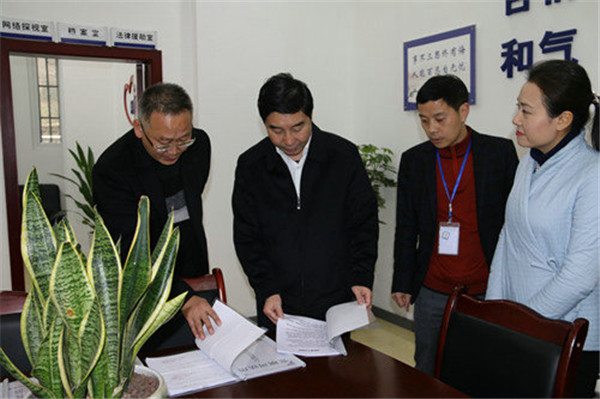 在張壩司法所,劉志誠察看了社區(qū)矯正宣告室、人民調(diào)解室、法律援助工作站,仔細(xì)翻閱相關(guān)資料,關(guān)切詢問工作人員司法所人民調(diào)解、法律援助等業(yè)務(wù)工作情況及對司法行政工作意見建議。走進龍馬潭區(qū)誠達公證處,映入眼簾的標(biāo)識標(biāo)牌讓劉志誠對該處的黨建引領(lǐng)和文化建設(shè)表示滿意,他親切地與公證員交流互動,了解公證處黨建促發(fā)展、公證參與司法輔助、“最多跑一次”、等工作情況。劉志誠指出,公證服務(wù)是黨委政府為民服務(wù)的形象和代表,要把人民群眾滿不滿意作為檢驗公證工作成效的標(biāo)準(zhǔn),全心全意為群眾做好法律服務(wù)。在自貿(mào)區(qū)在建瀘州市公共法律服務(wù)中心,劉志誠指出,公共法律服務(wù)中心是服務(wù)群眾的窗口,在設(shè)計規(guī)劃中要拓寬思路,整合法律服務(wù)功能,從便民利民出發(fā),從群眾的需要做起,將公共法律服務(wù)中心建成群眾滿意、企業(yè)滿意、黨委政府滿意的標(biāo)準(zhǔn)化服務(wù)平臺。