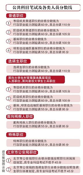 在日前公布的“京考”分?jǐn)?shù)線中,市區(qū)兩級普通職位的合格分?jǐn)?shù)線都要求行政職業(yè)能力測驗滿60分。市級普通職位總分要求滿110分,區(qū)級總分要求105分。分?jǐn)?shù)線最低的是艱苦邊遠(yuǎn)地區(qū)基層職位,其合格分?jǐn)?shù)線為行政職業(yè)能力測驗滿55分,且總分滿95分。