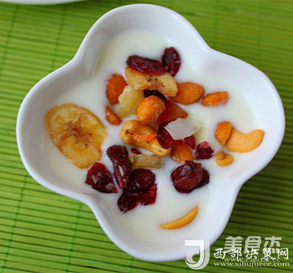 4.撒上各式果仁,包括蔓越莓干、香蕉干、椰肉干、腰果、花生等