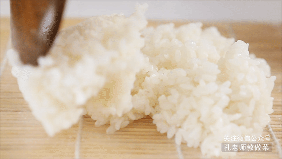 4.竹簾上鋪一層保鮮膜,將蒸好的米飯趁熱盛出鋪在竹簾上,竹簾邊緣留出2cm左右的空隙。(米飯趁熱時(shí)操作才不會(huì)粘手,如果有點(diǎn)粘手的話,可以將雙手粘少許涼白開(kāi)水操作。)