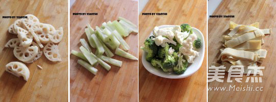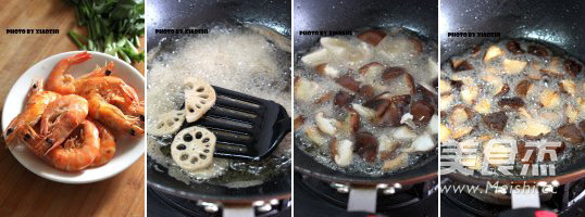 主料:雞翅中6個(gè)  大蝦6個(gè)  木耳60克  藕100克  豆皮100克  青筍200克  鮮香菇100克  西蘭花100克  菜花100克  金針菇1小把