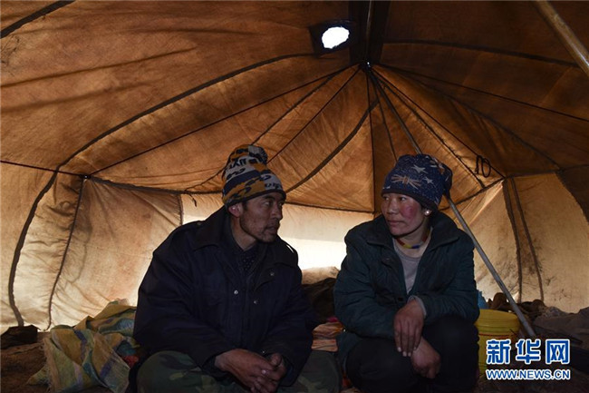 2月22日,查周和妻子在麥雄灘的帳篷內聊天。新華社記者吳剛攝