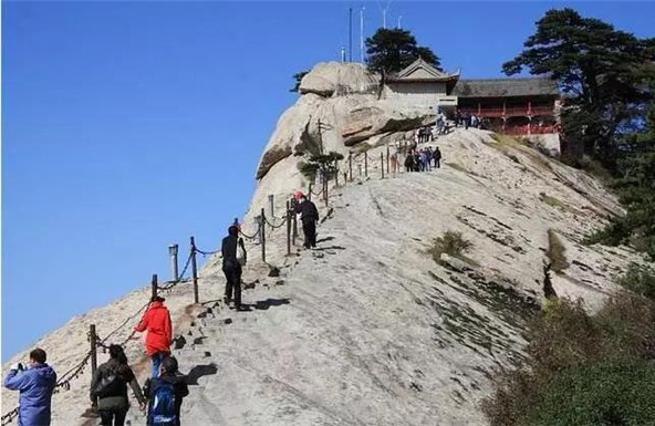 而被大家熟悉的長空棧道,則位于華山南峰東側山腰,是華山派第一代宗師元代高道賀志真為遠離塵世靜修成仙,在萬仞絕壁上鑲嵌石釘搭木椽而筑。去過華山的朋友,大部分肯定體驗過華山長空棧道,在千仞絕壁之上,左邊是大山,而右邊就是萬丈深淵,想要通過僅僅是靠著腳下這一寬30多公分的棧道,周圍無任何欄桿,但令人興慶的是,在崖上還有釘?shù)睦喂痰蔫F索可以抓住,讓探險者可以稍微放松一點心情。