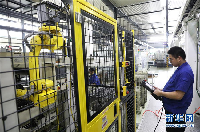 在位于重慶永川鳳凰湖工業(yè)園的重慶西源凸輪軸有限公司,工作人員在調(diào)試自動(dòng)化生產(chǎn)設(shè)備(2018年7月31日攝)。新華社記者王全超攝