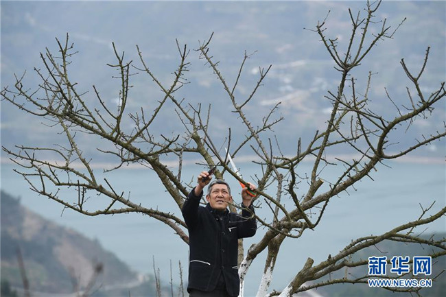 重慶市巫山縣曲尺鄉(xiāng)朝陽村村民在脆李種植地里對(duì)脆李樹進(jìn)行管護(hù)(2019年2月16日攝)。新華社記者王全超攝