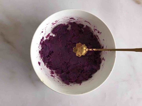 4.將剩余牛奶倒入紫薯泥中拌勻